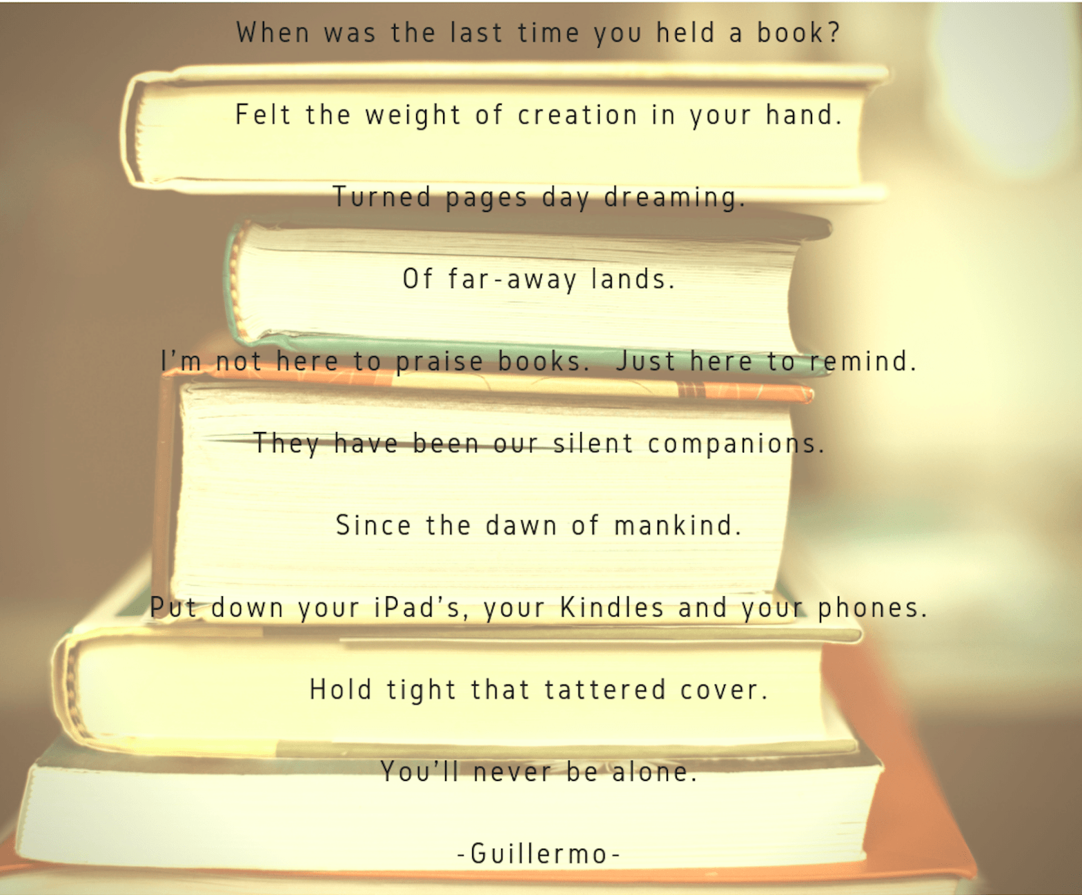 Books honor the human condition. They keep our traditions alive, awaken our imagination and put our little ones to sleep.